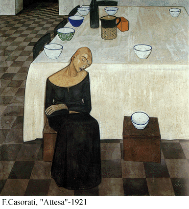 Tuttavia c'è sempre nell'artista un margine di distacco che gli impedisce di aderire incondizionatamente a questa o a quella definizione poetica: fin dal 1919, a contatto con la pittura metafisica, gli era venuta la conferma della necessità di un "classicismo" che aveva dato l'avvio alla costruzione di grandi forme statiche, estremamente semplici e severe, disposte in uno spazio prospettico rigoroso, come testimonia l'emblematica "Attesa" (1921) [foto 3]. Non si tratta di un richiamo all'ordine come quello praticato negli Anni Venti dal movimento di Valori Plastici, nazionalista e fondamentalmente astorico, ma di una ricerca condotta rigorosamente a conseguire il controllo razionale della forma e la solidità plastico-volumetrica.